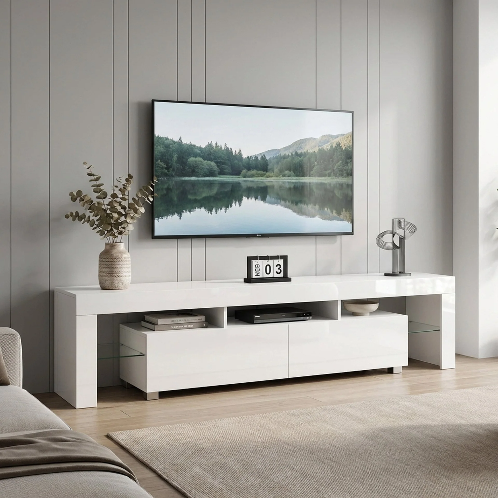 The Arvada LED Entertainment Unit in White showcases a sleek modern design with high-gloss finishes and integrated LED lighting. It features spacious drawers and glass shelving for stylish storage. Perfectly blending aesthetics and functionality, it adds a contemporary touch to your living room setup.