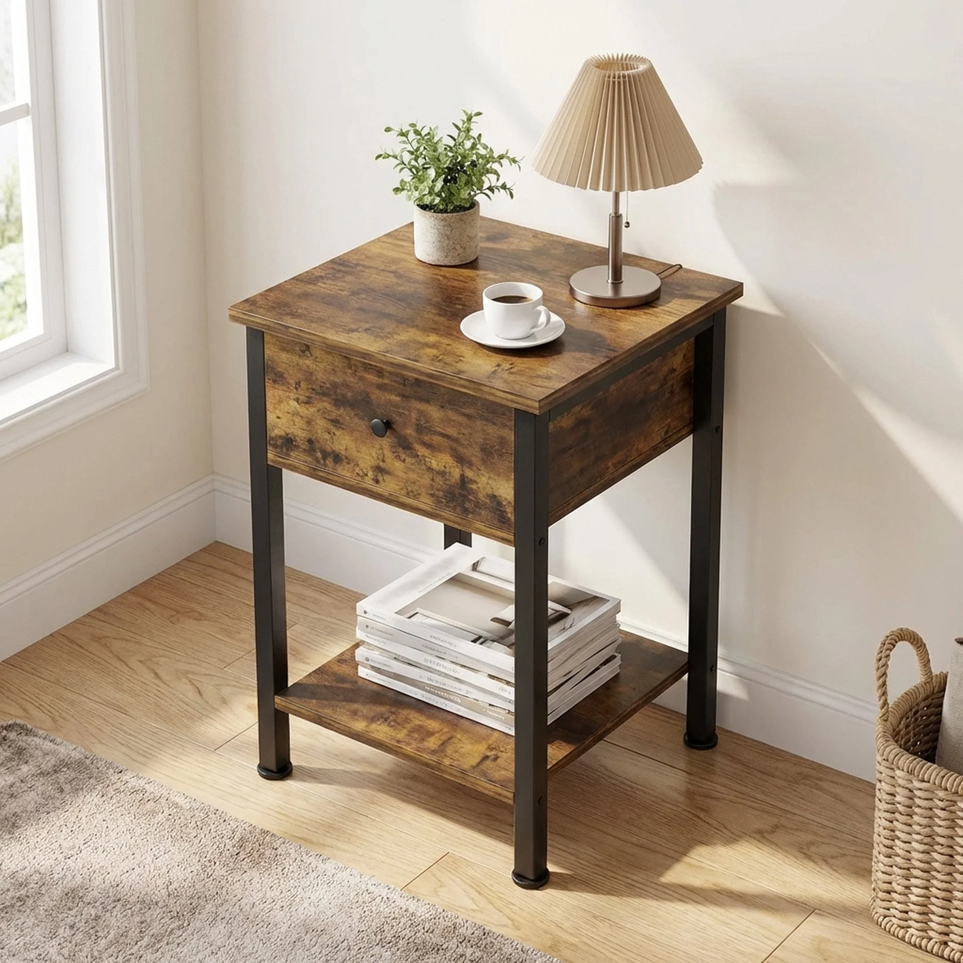 This side table has a small footprint and classic look, so it slots right next to your bed, couch, or even along a hallway. The clean lines and earthy tones of it make it a great choice to harmonize rustic and industrial design while also offering character & function to your home.