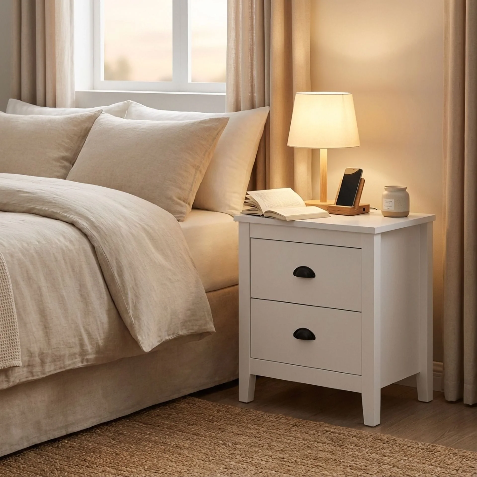 This Congo bedside table is one of our Congo range products with its clear lines and refined look that will demonstrate your distinctive taste and brighten up your bedroom, which perfectly combines an understated look and simple versatility. Made from high quality MDF, this bed side table has four beautifully tapered support legs that connect the body, which gives it a sturdy structure that will last for many years. It has two drawers with black metal handles, providing plenty of space for your daily essentials and hidden away. Not only that, with its flat tabletop providing ample space for your lamp, alarm clock or other items, this nightstand helps you keep all your bedroom essentials within reach and makes it easy to grab everything when you're lying in bed.