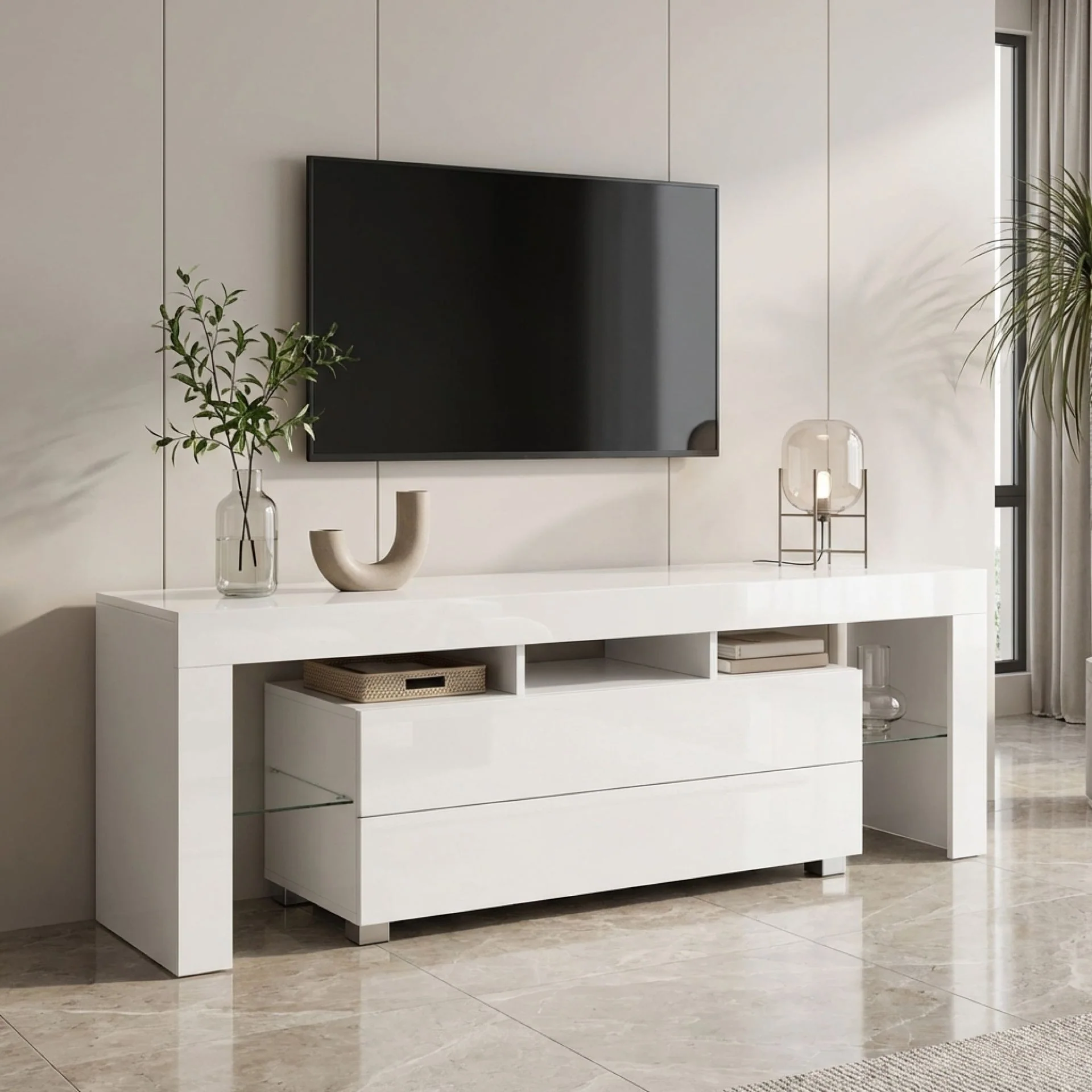 The Dothan LED Entertainment Unit combines sleek modern design with functionality. Its high-gloss white finish and glass shelving exude elegance, while integrated LED lighting creates a vibrant display. It offers a clean, minimalist aesthetic with ample storage for electronics and décor.