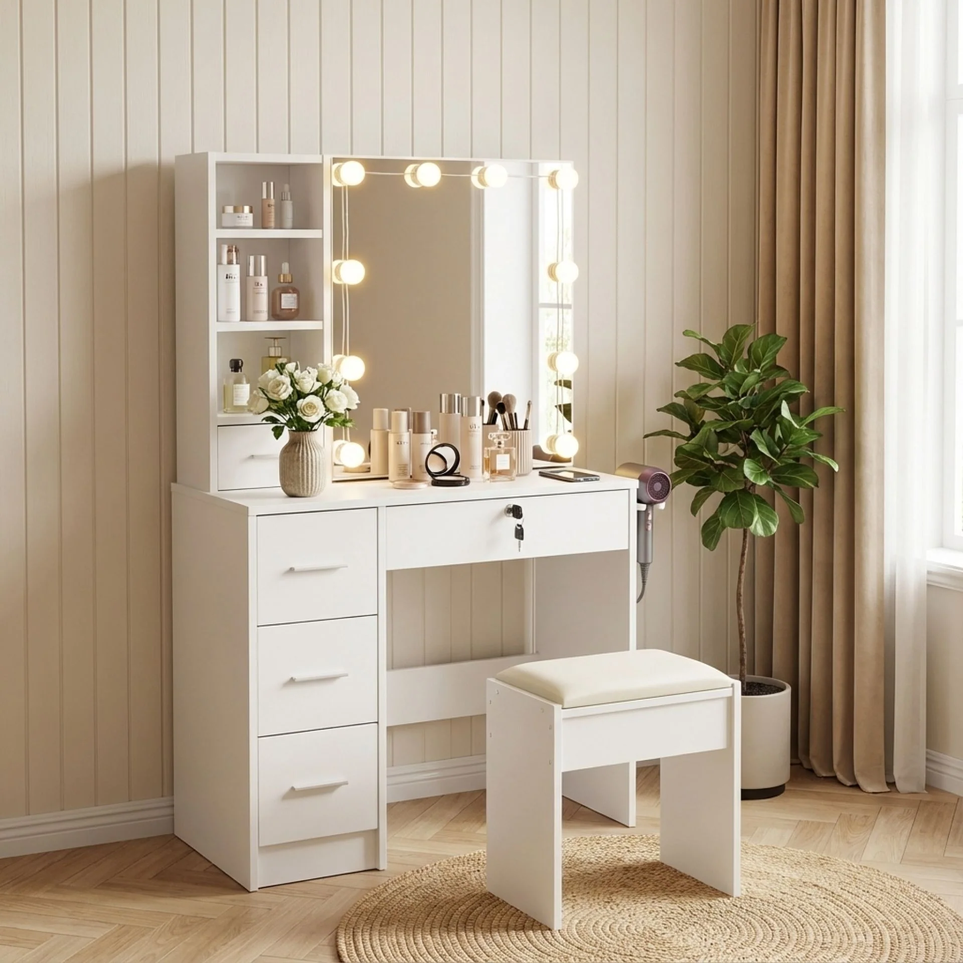 Make your morning routine a breeze with the FREESIA Dressing Table Set. This 2-piece vanity includes a spacious tabletop, multiple drawers for your beauty essentials, and a mirror surrounded by LED lights.