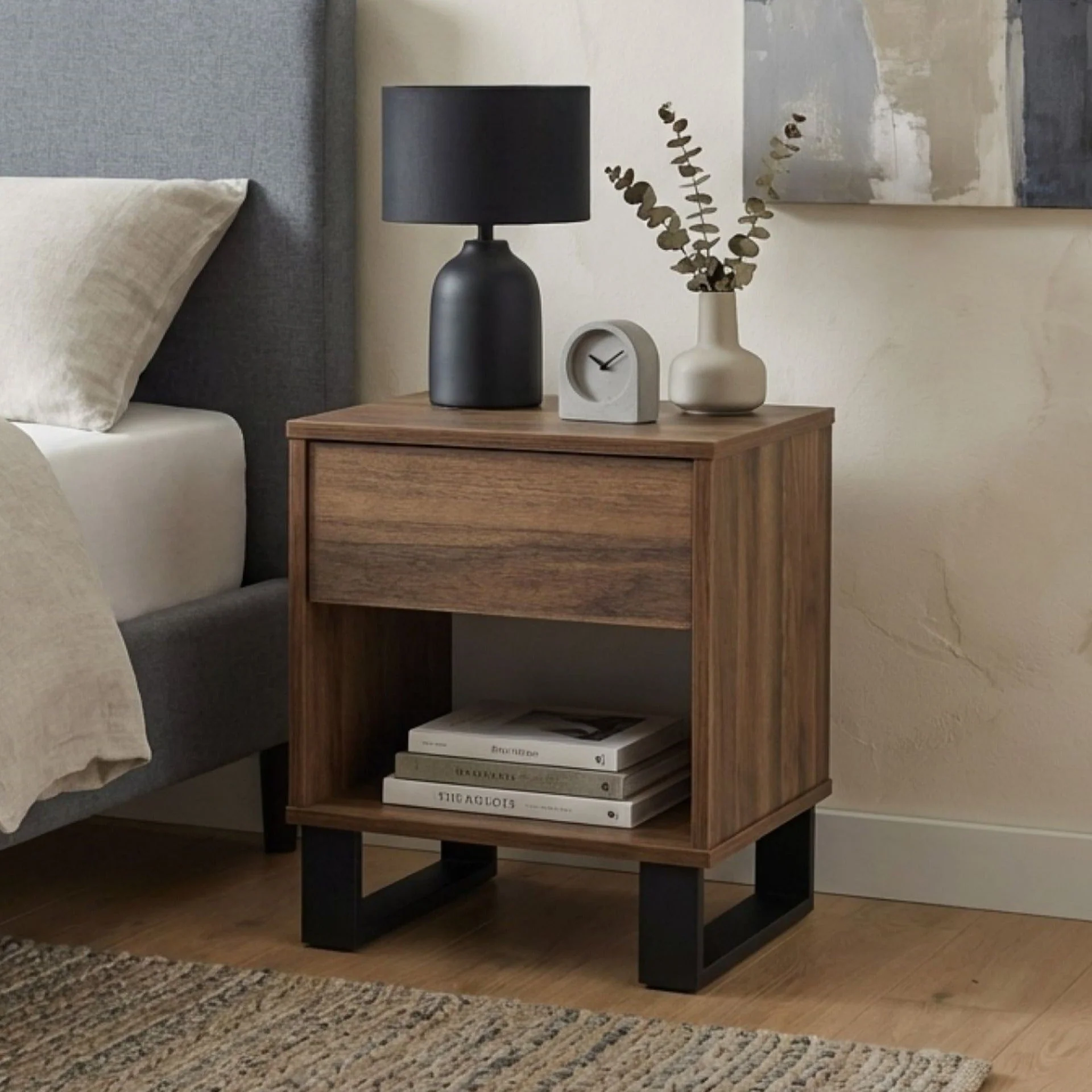 This FROHNA Bedside Table is one of our FROHNA range products with a simple and modern style look makes a great décor for home. Crafted from quality wood with black metal accents, this bedside table is sturdy and durable for years of service; the drawer provide ample space to stow away your phones, books, photo frames etc. and keep everything hidden; also come with open shelf can be used to display some attractive art pieces in the bedroom and the large flat top offers great space to perch your lamps, alarm clocks and other accessories.