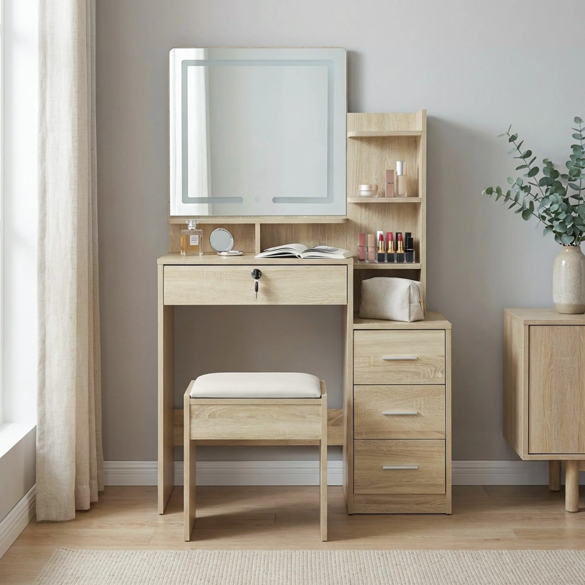 Start your day with elegance and functionality using the GARDENIA Dressing Table Set. Designed to simplify your daily routine, this 2-piece vanity set features a spacious tabletop, single drawer for essential storage, and a large LED-lit mirror that provides optimal visibility. The matching stool with cushioned seating ensures comfortable use, while the clean oak finish blends beautifully with a variety of bedroom décor styles.