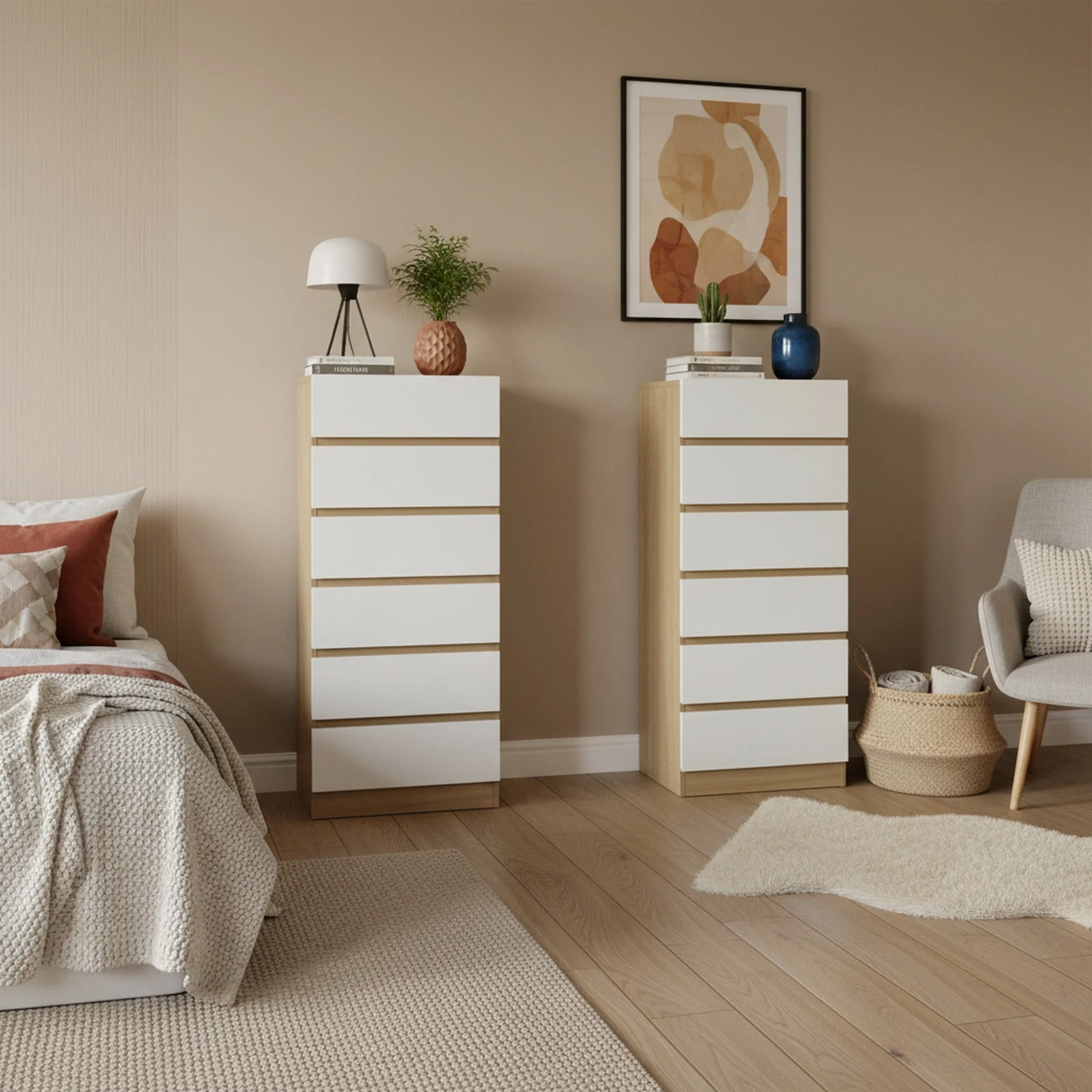 Harris 6 Drawers Slim Tallboy - Oak + White