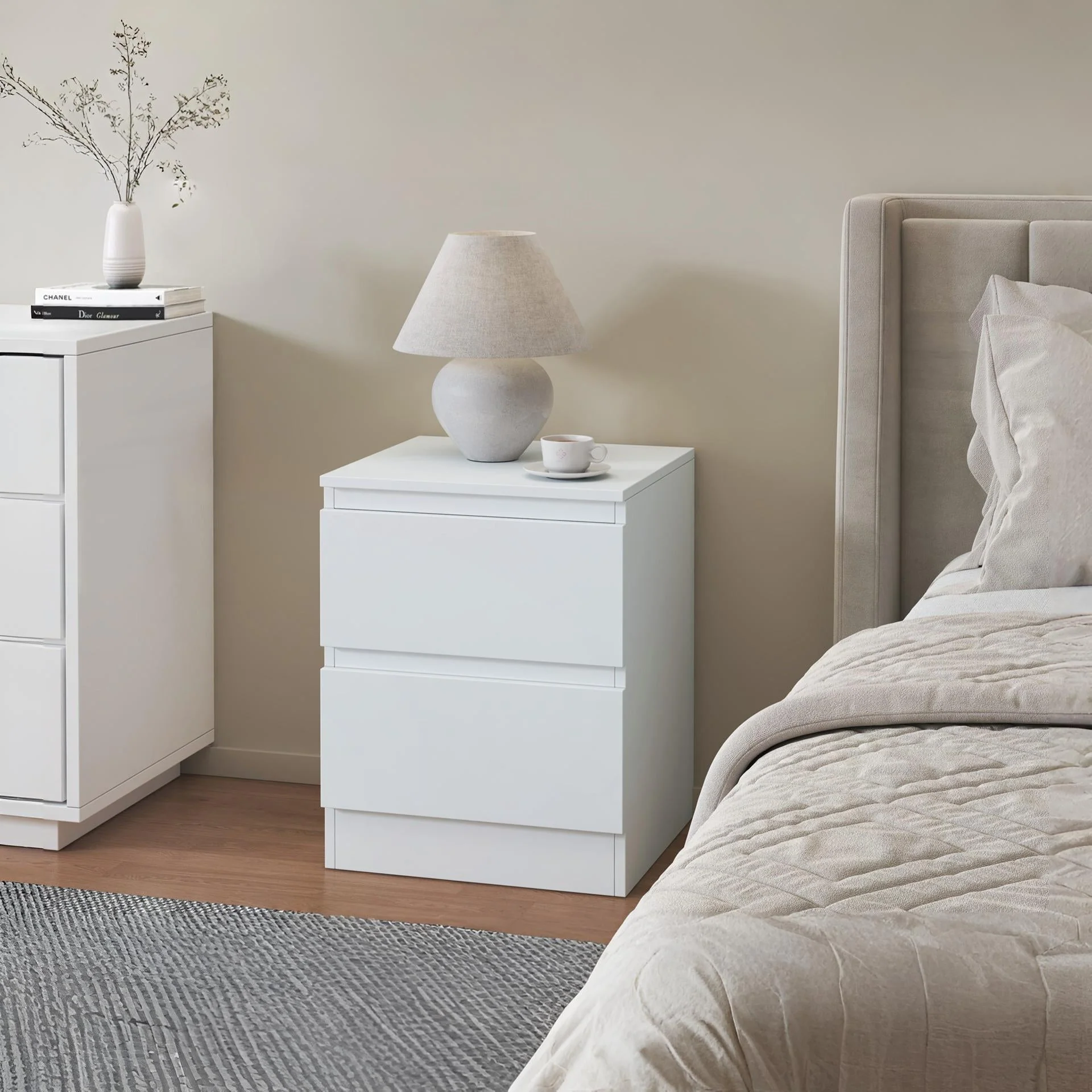 For a simplistic, understated product that will easily melt into modern interiors, the Hollis Bedside Table in white is ideal. With its slim shape and subtle finish, it beautifully complements your sleeping environment.