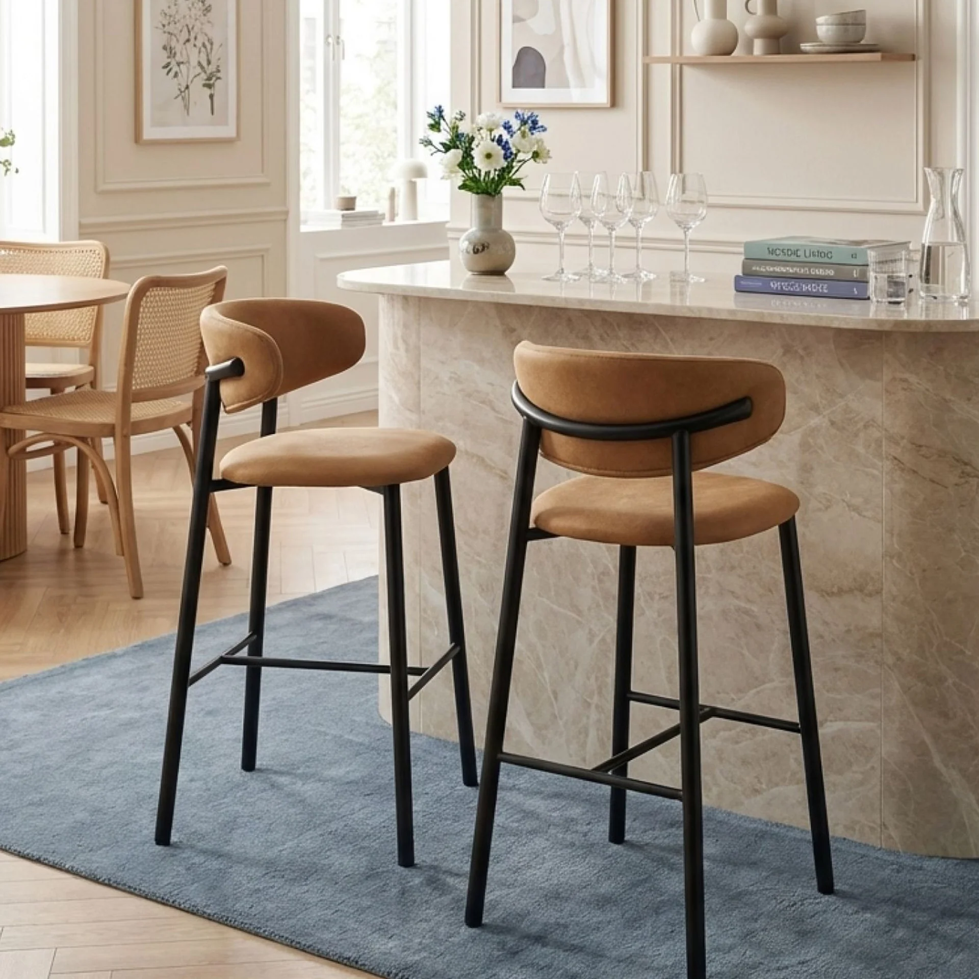 The Lark Bar Stool features a vibrant fabric seat, adding a splash of modern charm to any space. Its metal legs with a black powder-coated finish provide robust support and a sleek look. Combining comfort with durability, it’s perfect for kitchens or bar settings.