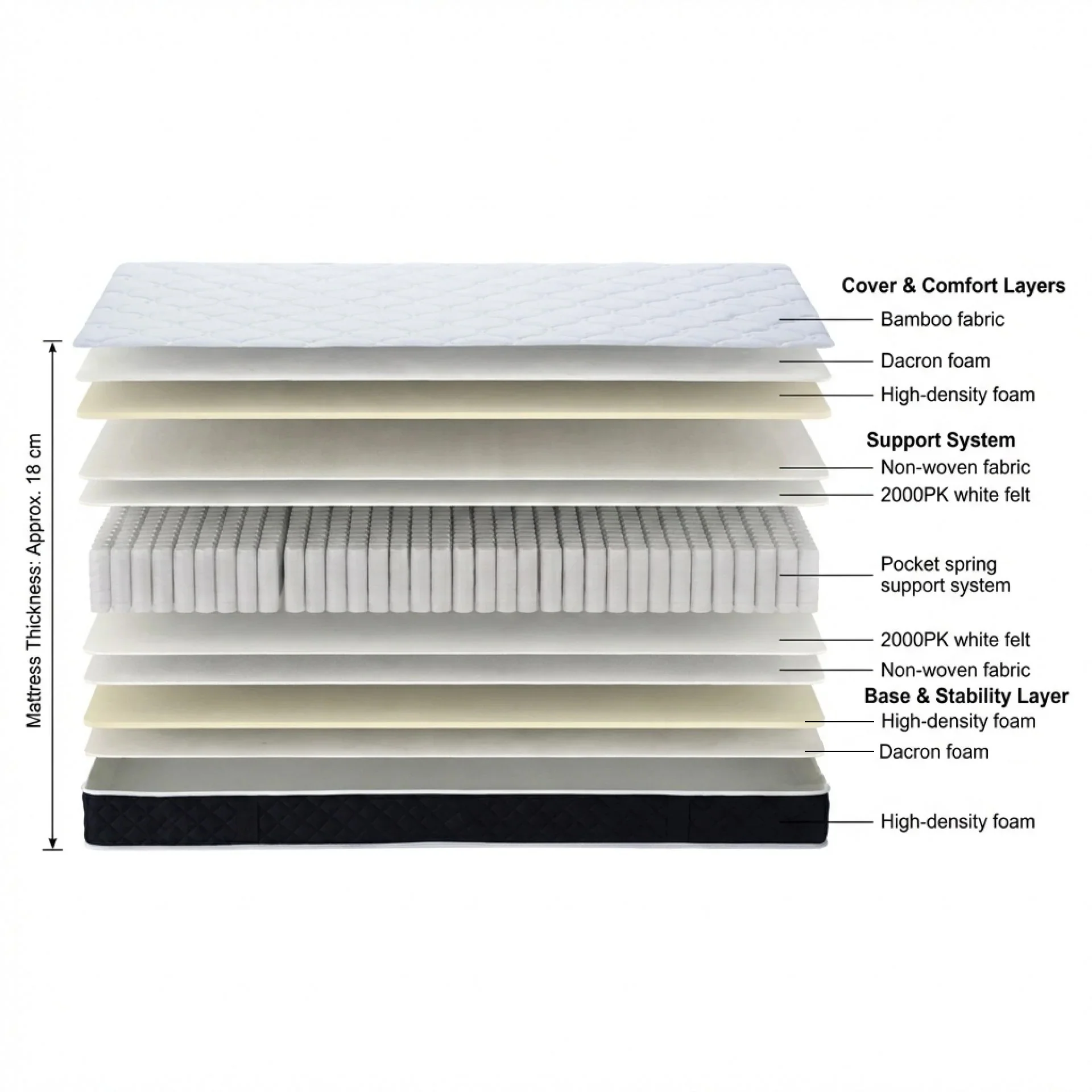 Inside, high-density foam delivers a perfect balance of support and softness, while the durable pocket springs resist deformation, maintaining consistent support over time. With its excellent elasticity, the bamboo mattress provides adaptive body support for a truly restful sleep. Engineered for durability, the mattress offers superior wear resistance, promising long-lasting use.
