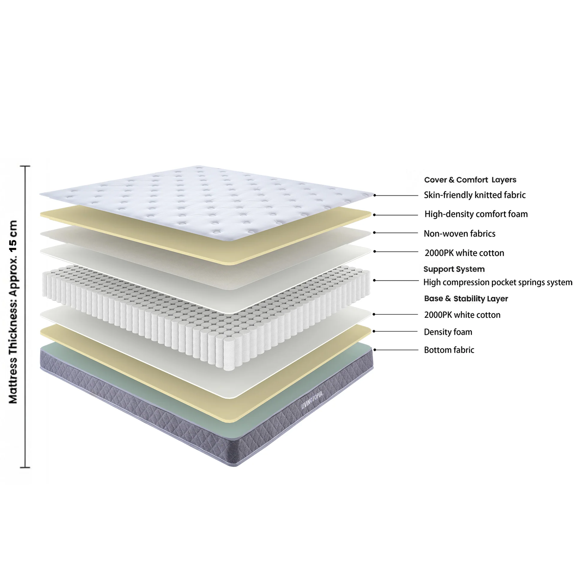 Sleep in everyday comfort with the LivingTopia DreamNest Classic Double Mattress. With breathable materials, full-body spring support, and cushioned foam layers, itās the perfect fit for young adults, shared flats, or guest bedrooms.