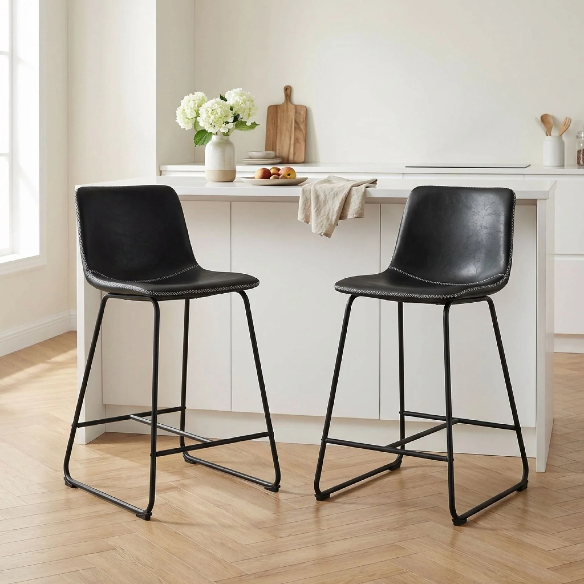 Elevate your casual seating space with the Luke Bar Stool set in timeless black. Featuring a modern silhouette and contoured seats upholstered in smooth PU leather, these stools offer the perfect blend of sophistication and comfort. A great match for kitchen counters, bar tables, or high dining benches.