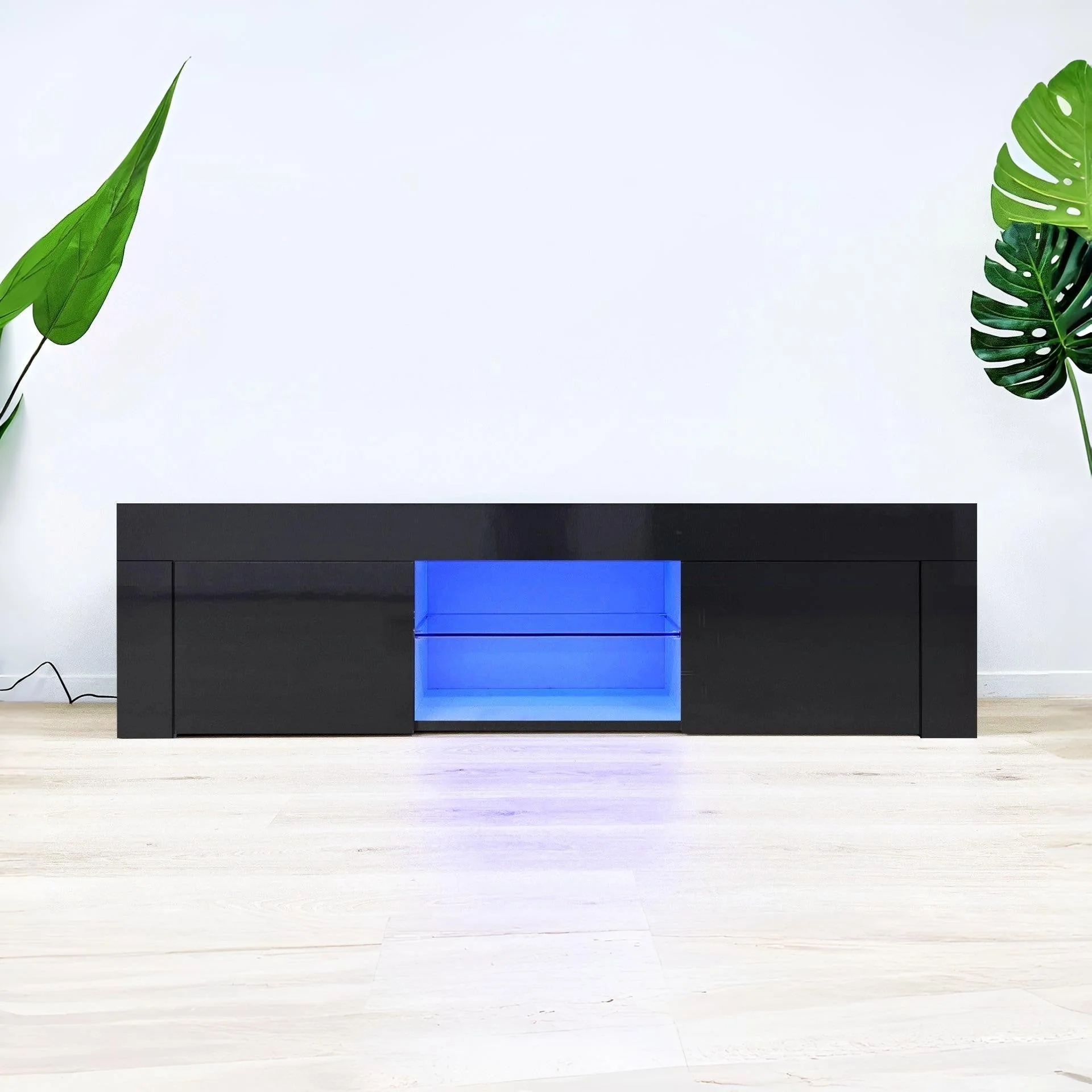 The Maize LED Entertainment Unit features a sleek black finish with a contemporary design. Its tempered glass shelves are illuminated by vibrant LED lighting, creating a modern and stylish ambiance. Ideal for organizing electronics, this unit enhances any living room with functional elegance.