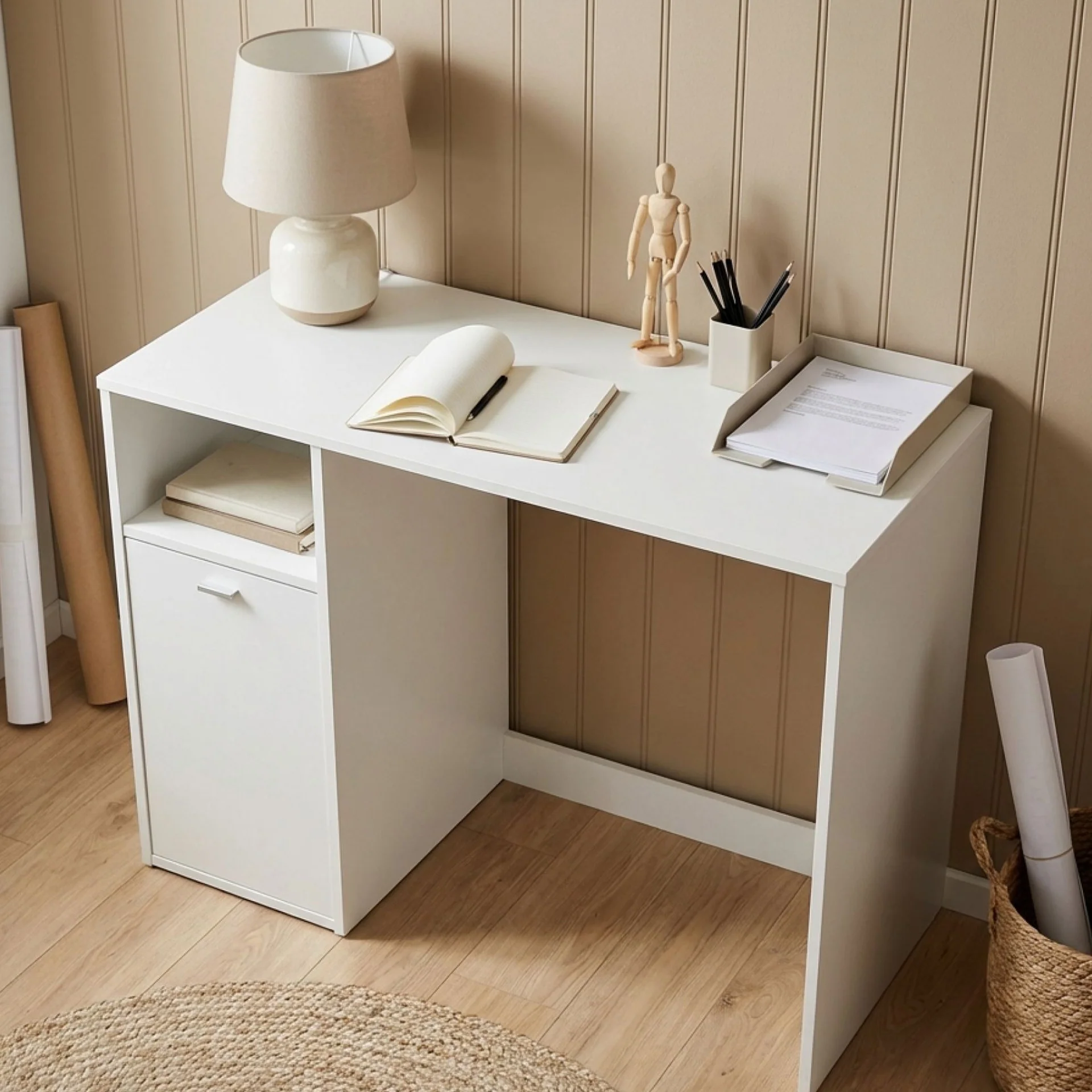 Woven throughout a cupboard to hide it away and some open shelving, this desk can store a variety of books, supplies and personal effects. Hideaway integrated handle of the cupboard gives it a clean look and hides messy things inside.