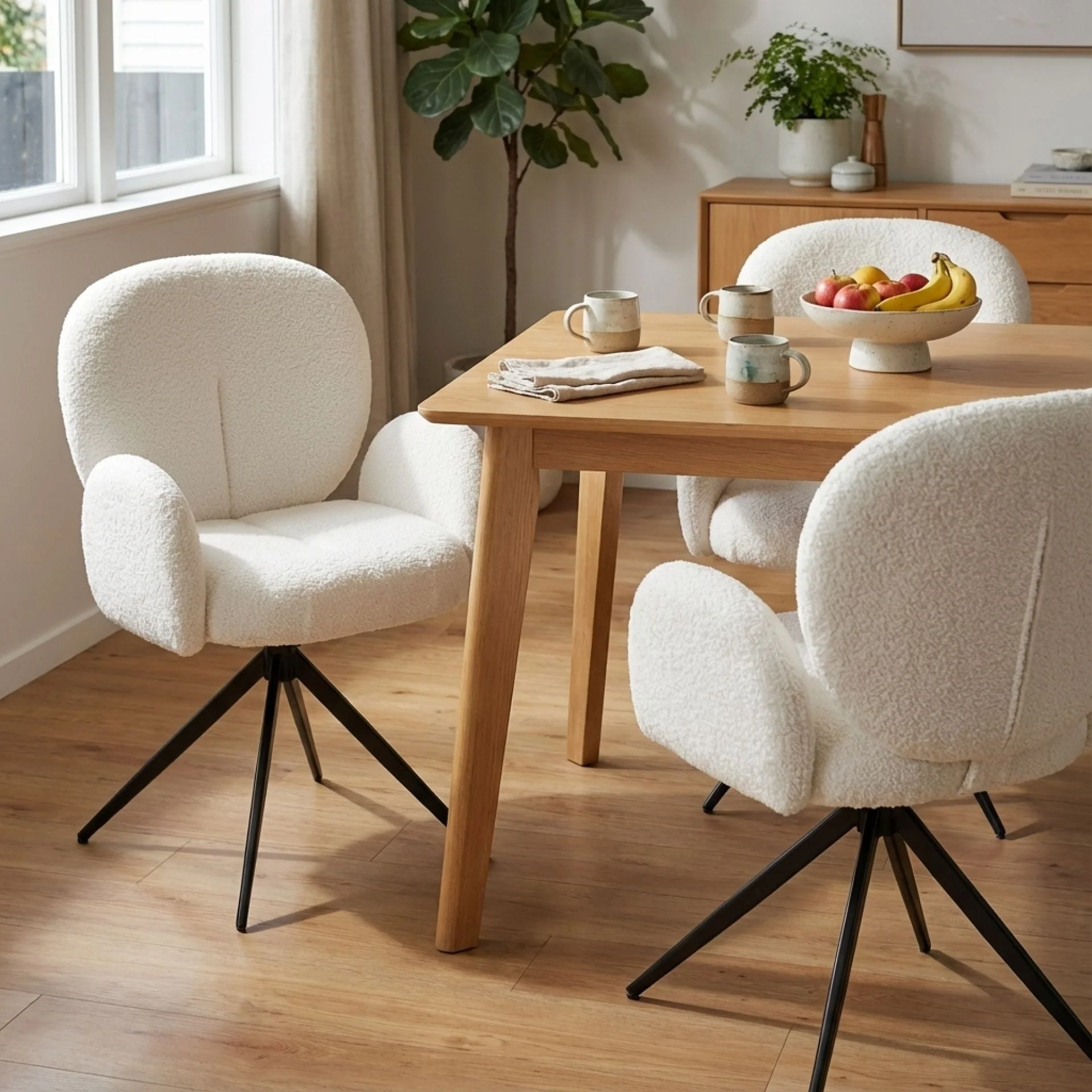 Designed for modern living, this chair features cosy teddy fabric upholstery and thickly padded seating. The X-shaped black powder-coated legs offer stability, while the 360° swivel adds functionality. Its comfortable backrest and armrests make it a perfect choice for versatile dining spaces.