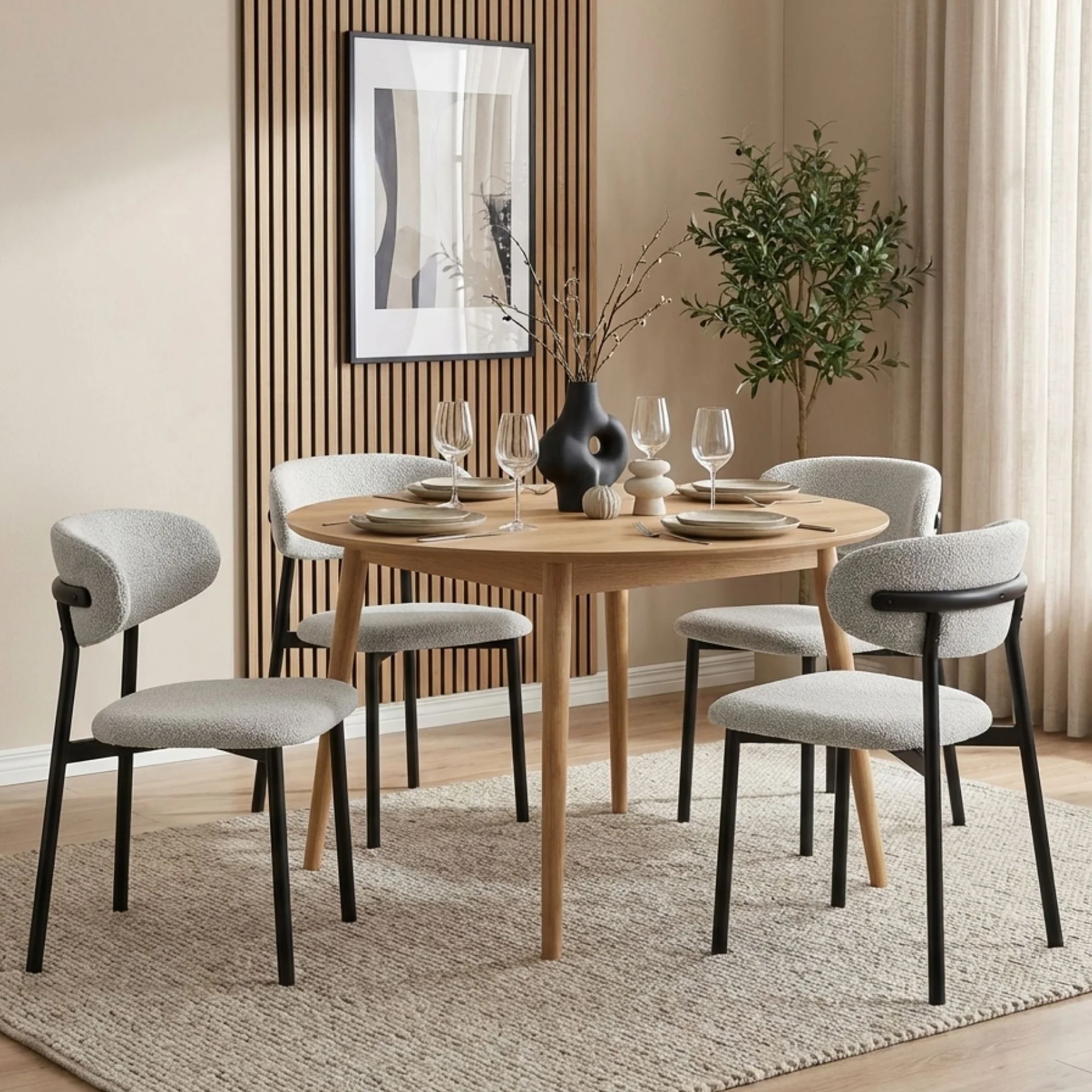 The Merrit Dining Chair set offers a refined combination of fabric seats and sturdy black powder-coated metal legs. Designed for contemporary spaces, these chairs blend comfort with minimalist elegance, making them perfect for both formal dining rooms and casual settings.