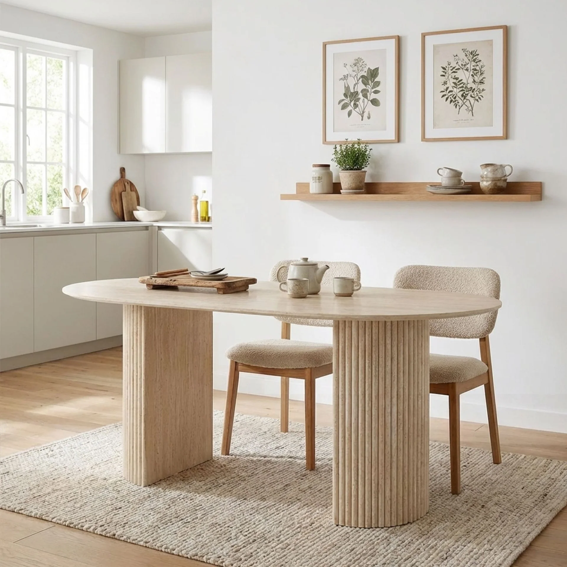 Designed for versatility, this oval dining table boasts a travertine-look top and sturdy MDF board construction. The dual semi-circle base and strong legs ensure stability, making it ideal for both modern and classic interiors. Its spacious surface suits all your dining and gathering needs.