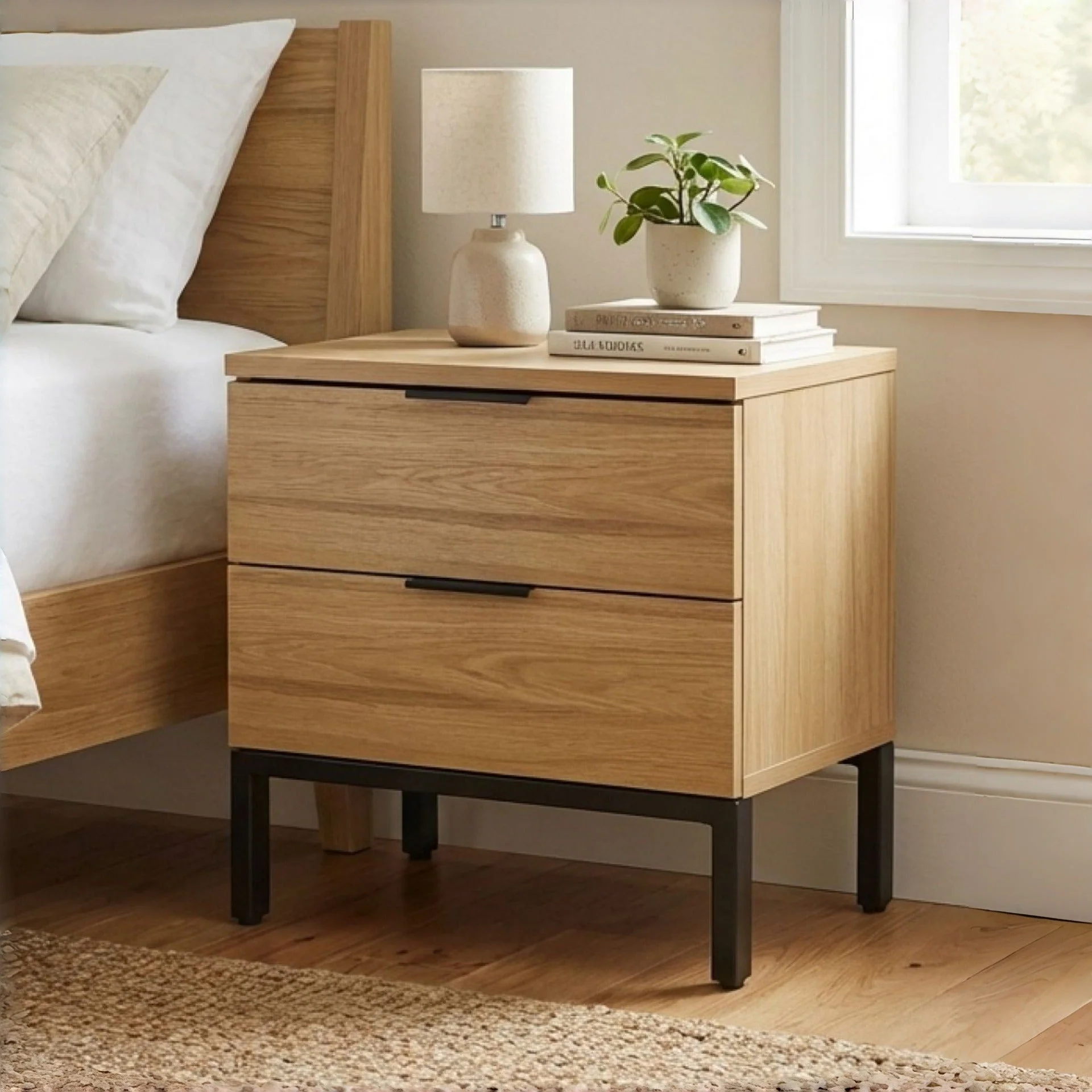 This OCALA Bedside Table is one of our OCALA range products which will be a perfect addition to your bedroom and suits any modern or rustic décor perfectly. Made of high quality MDF board with black metal accents, this bedside table is sturdy and durable for years of service; the 2 drawers provide ample space to stow away your phones, books, photo frames etc. and keep everything hidden; while the black alloy handles and smooth drawers with metal runners make it a pleasure to use.