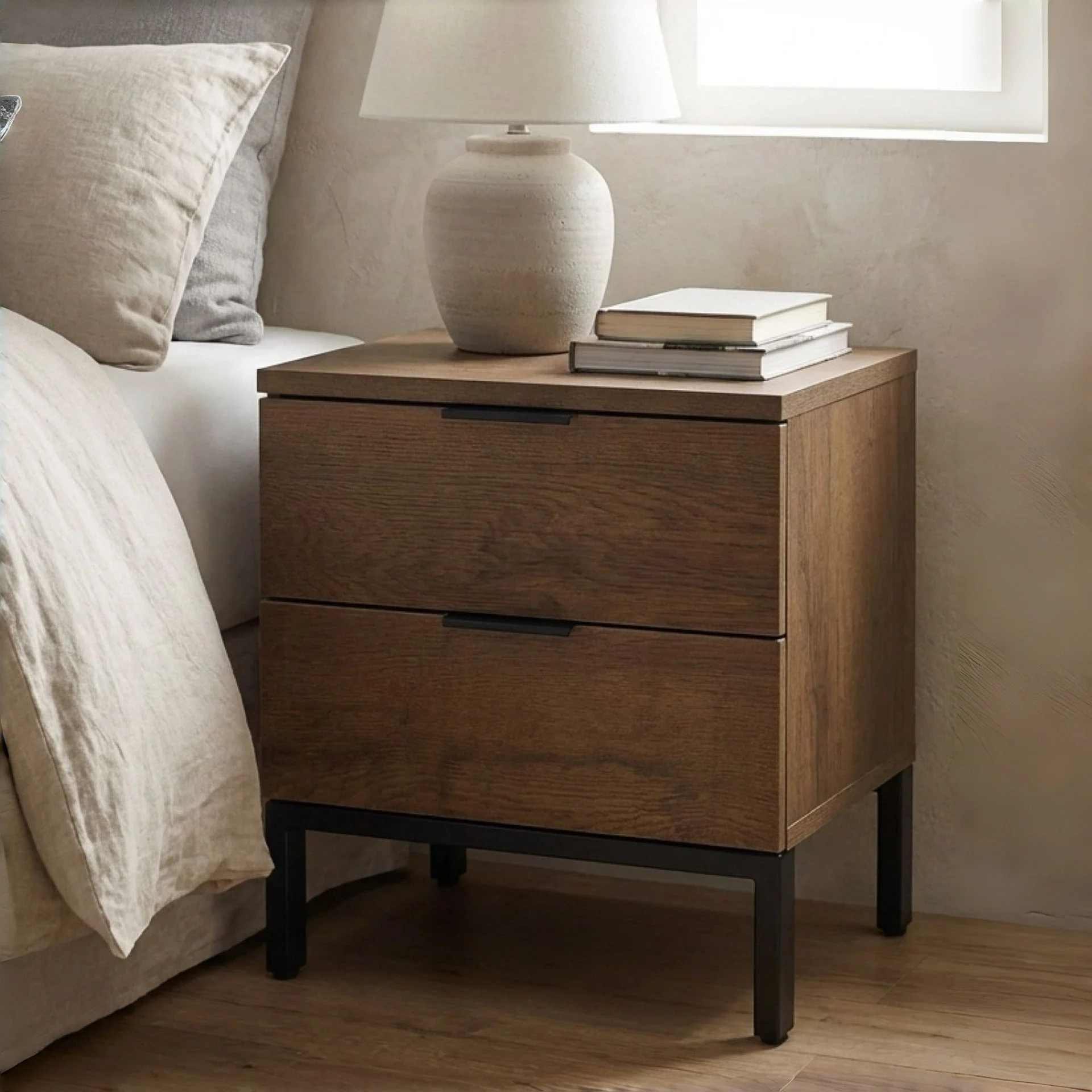 This OCALA Bedside Table is one of our OCALA range products which will be a perfect addition to your bedroom and suits any modern or rustic décor perfectly. Made of high quality MDF board with black metal accents, this bedside table is sturdy and durable for years of service; the 2 drawers provide ample space to stow away your phones, books, photo frames etc. and keep everything hidden; while the black alloy handles and smooth drawers with metal runners make it a pleasure to use.