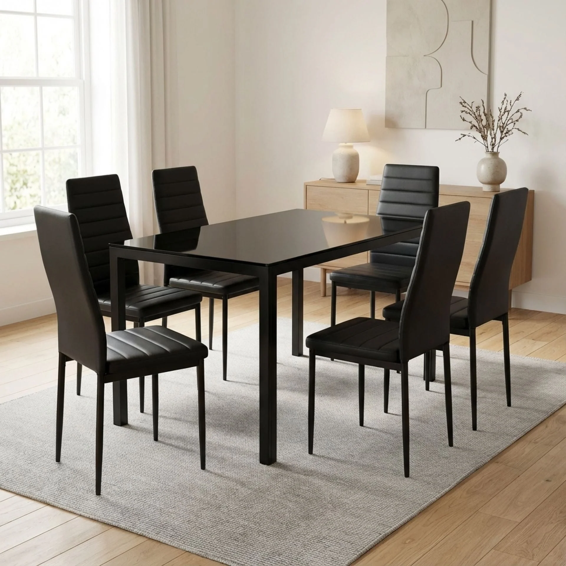 This upgraded dining set includes a 1.6m rectangular table and six matching chairs – ideal for hosting guests or everyday family meals. The table features a black powder-coated steel frame with a tempered black glass tabletop, creating a sleek, durable centrepiece. Paired with six black PU leather chairs supported by slim, black-coated metal legs, this set delivers unified elegance and lasting comfort.