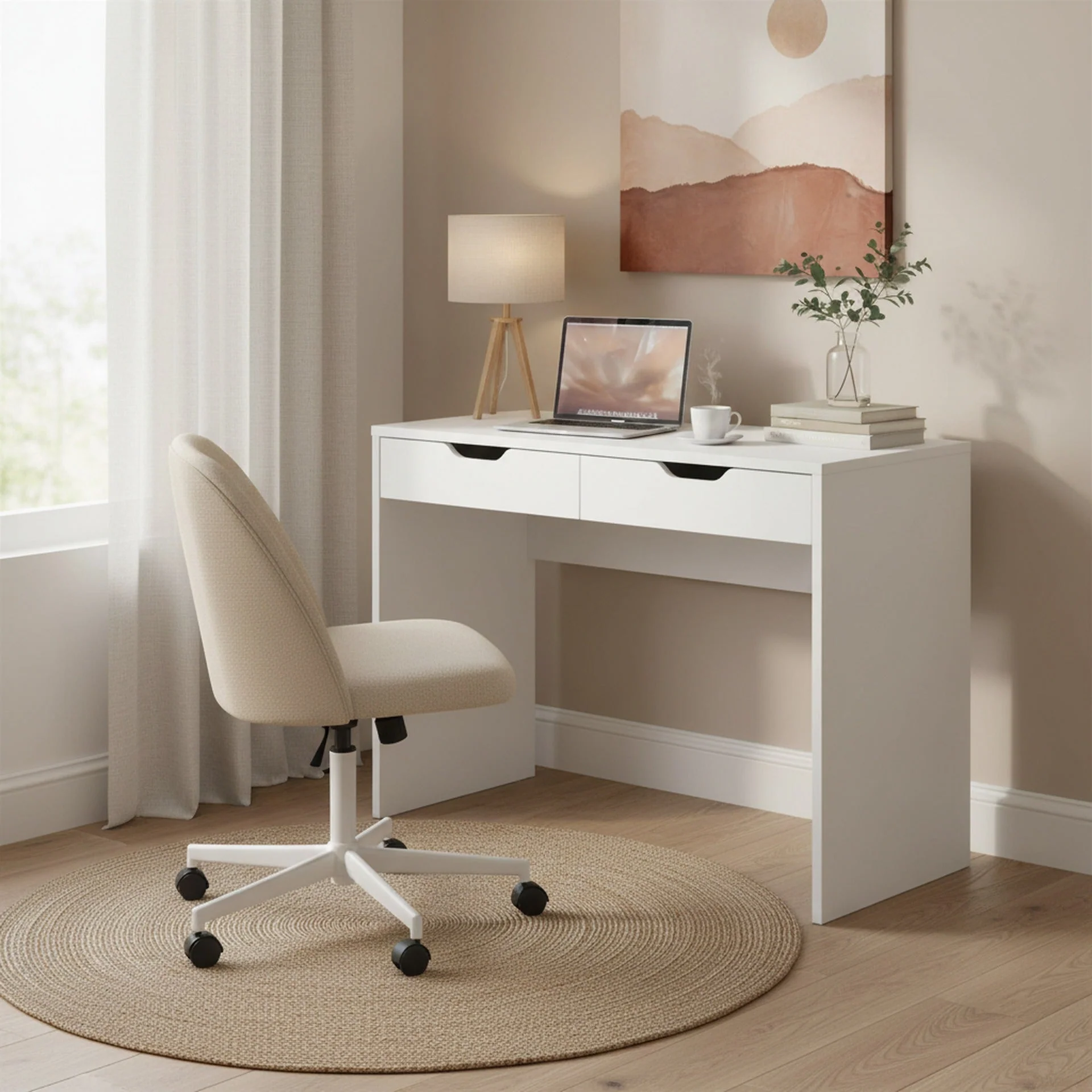 For a clean, simple, and modern look, we recommend the Schertz 100cm Computer Desk. The white finish in a clean melamine coat is bright and matches almost every décor style, and it complements the lightness of an open workspace.