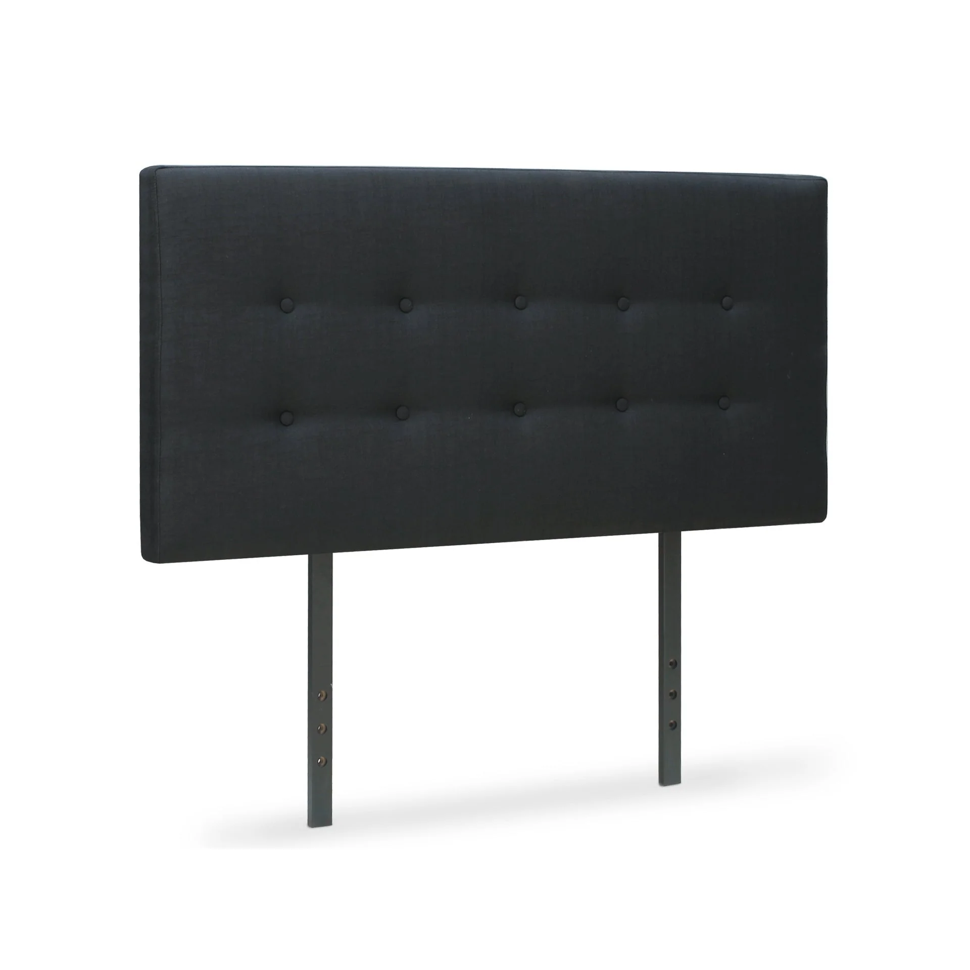 This headboard features a sleek charcoal fabric with button-tufted detailing and a minimalist rectangular design, adding elegance to any bedroom.