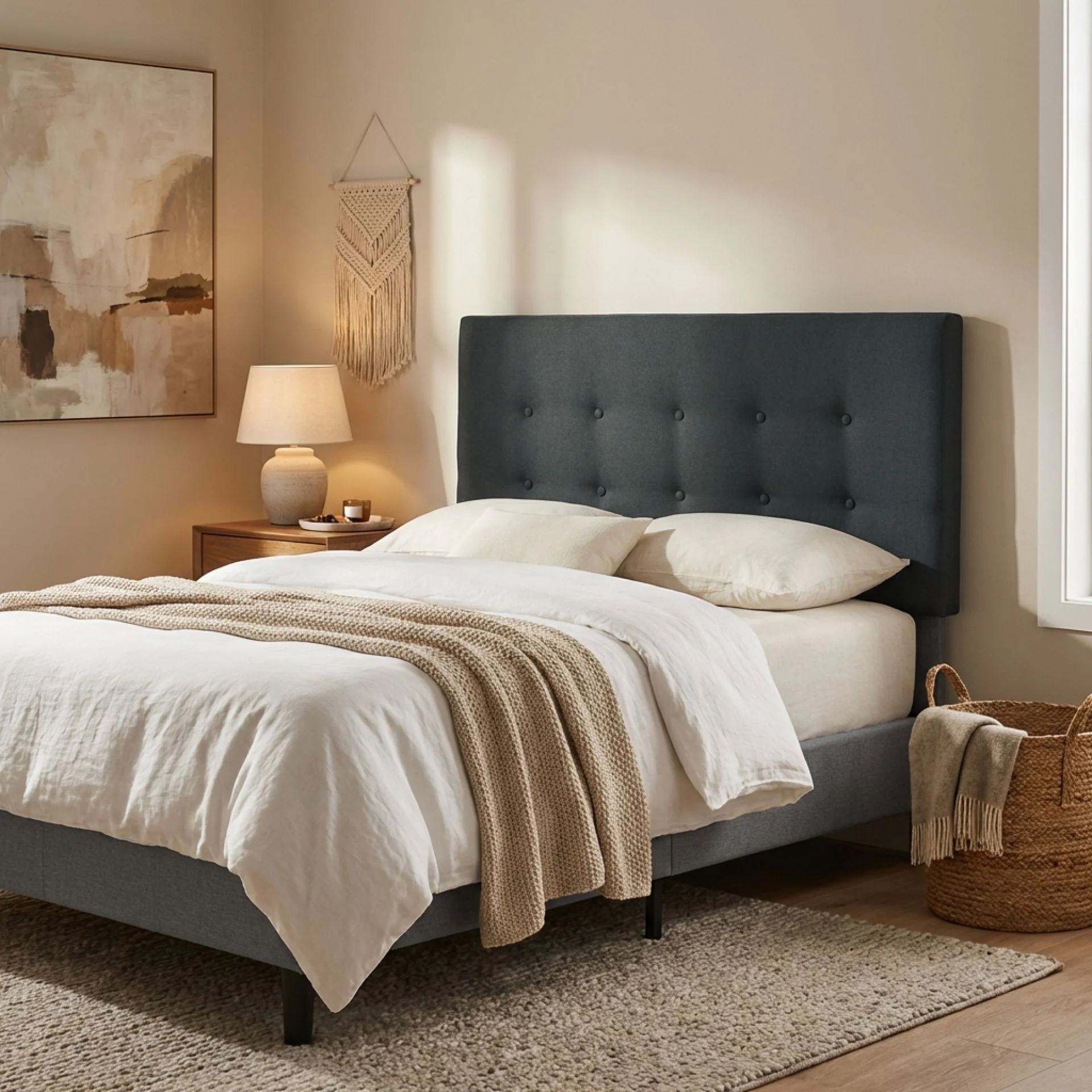 Choosing a simple design headboard would instantly add on style to your bedroom, and if your bedroom start to look a bit dull, then this Fabric Upholstered Headboard would be a great choice. Elegance could be very straight forward and you do not need too much decorations and shapes, just simple clean straight lines as this headboard features. Tufted with simple buttons added touch of adequate decor, padded with comfortable foam and upholstered with polyester fabric to give beautiful linen look. It is not just a beauty with looks but also has quality wooden structure made with solid wood and plywood.