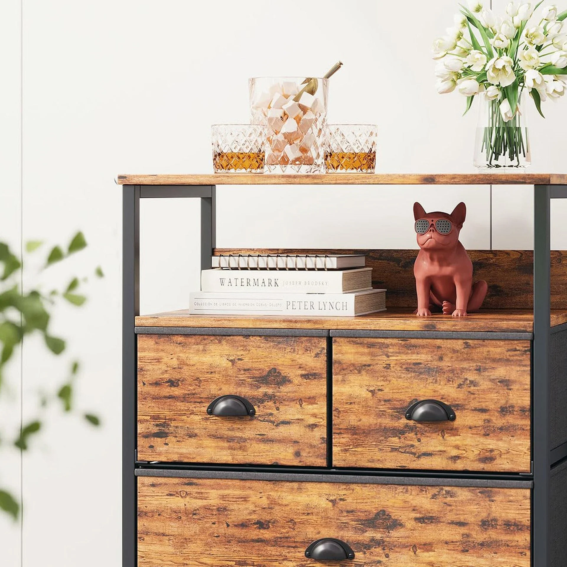 Fashioned from high-quality MDF board with a rich wood grain finish, this nightstand exudes a timeless vintage appeal that instantly enhances any living space. Its sturdy metal frame not only ensures durability but also adds an industrial touch, making it a versatile piece suitable for various rooms including the living room, kitchen, or bedroom. The three spacious fabric drawers with handles and an open storage shelf with anti-fall backboard. Designed not only for ample storage but also for ease of use, they offer a perfect blend of functionality and style.