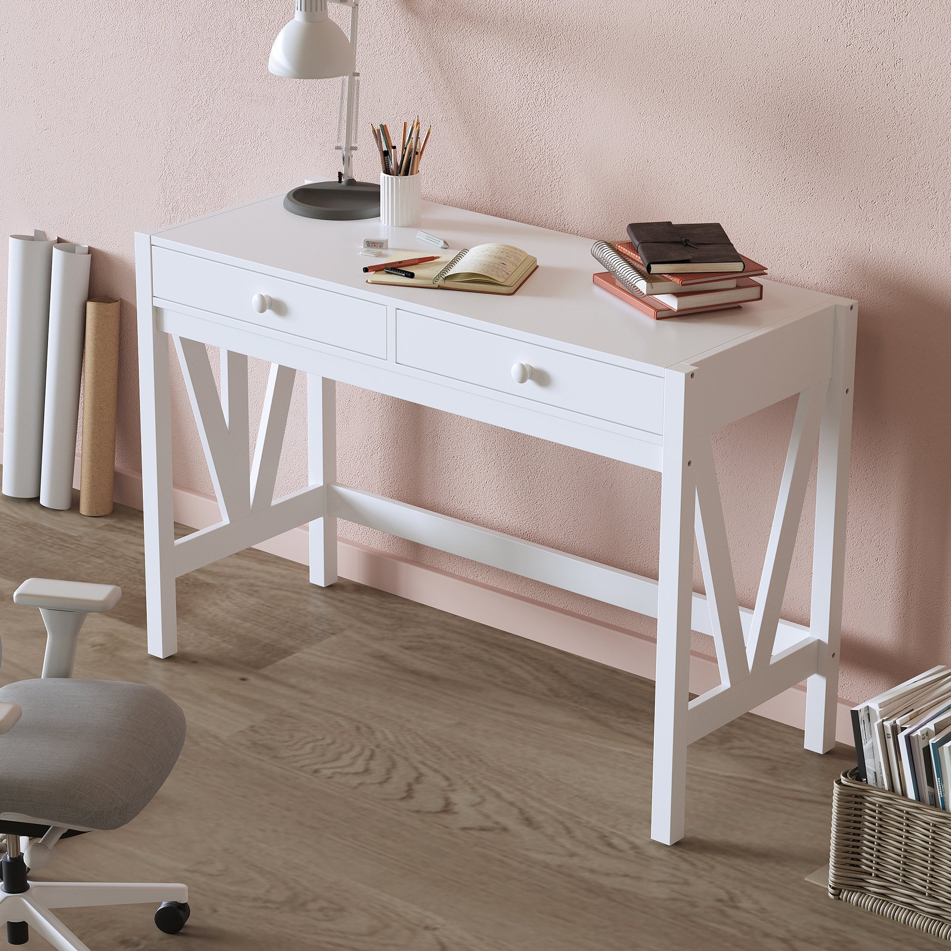 The table is designed for long-lasting durability using smooth white paper laminated particle board. Two roomy drawers with adorable round knobs offer plenty of storage for the essentials, and the extra-wide tabletop is ideal for decorative objects, books, or work materials.