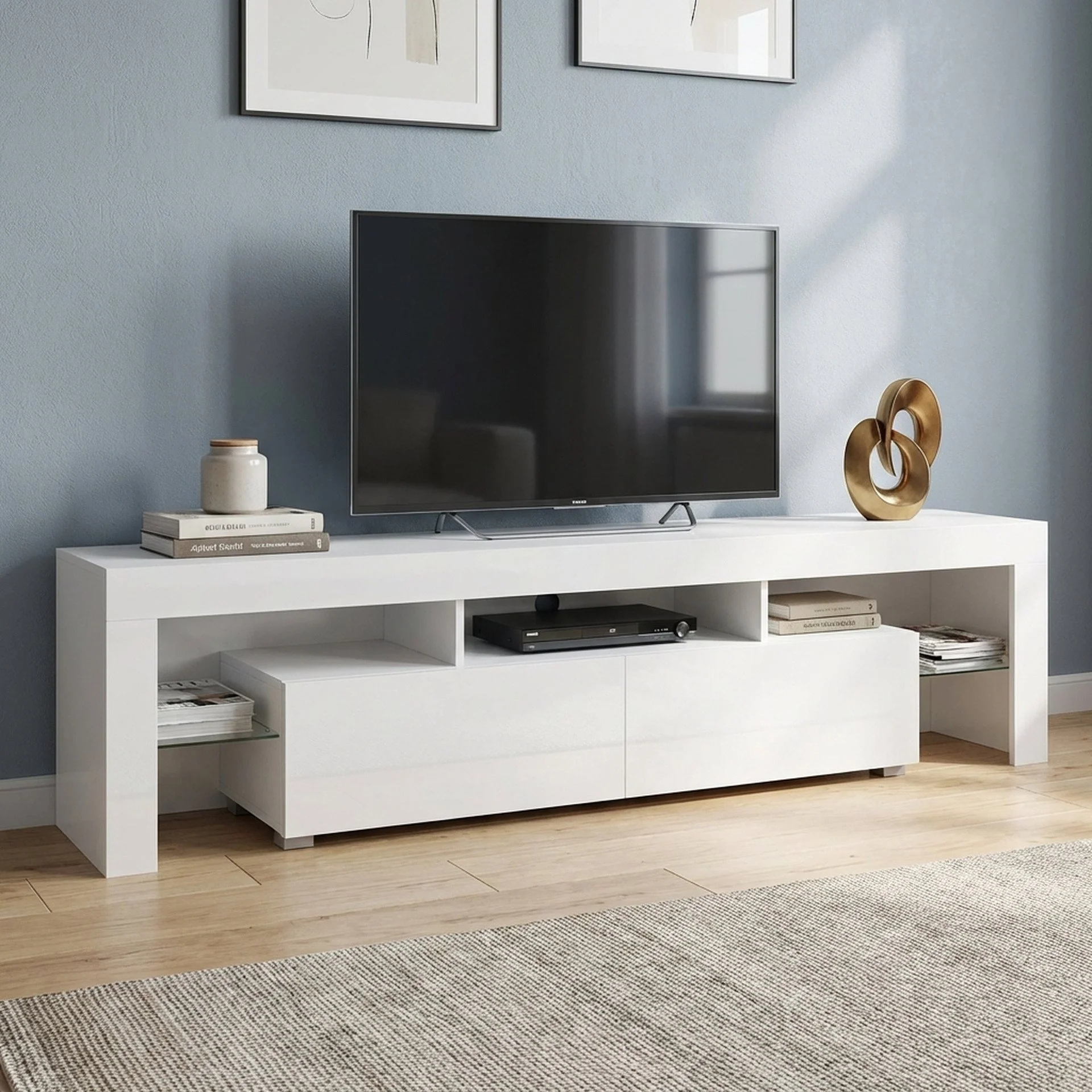 The Zoar LED Entertainment Unit in white combines modern elegance with functionality. Featuring sleek high-gloss surfaces, tempered glass shelves, and integrated LED lighting, it offers ample storage while elevating your living room's ambiance. A perfect blend of style for contemporary interiors.