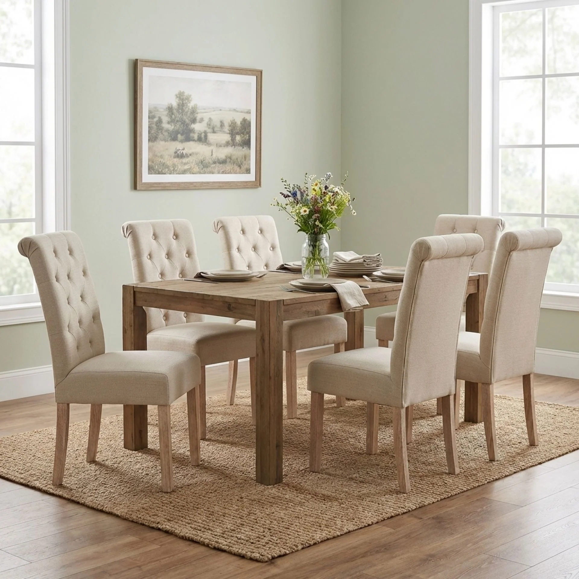 The unique design and super soft texture of these 6pcs dining chairs will match a wide variety of room decors. Designed with generosity and comfort in mind, this dining chair features a unique button backrest with rolled top, comfy padded seat and solid wooden legs. The chair is covered with fabric material and upholstered foam with a charming button tufted backrest for extra texture and dimension, while the backrest with a gentle curve and rolled top that keeps the look refined provides excellent lumbar support to guarantee everyone’s comfort. Besides, the chair with enough large size provides a comfortable seat which is padded with soft polyester material for a long chat over dinner, also offers the frame and four legs with sturdy construction to make it stably. These gorgeous dining chairs come as a set of six while the right amount to match a dining table, counter or desk. No matter putting in a living room, dining room or study room. It will easily fit in any space with any table of your choice. They can be used as extra seating to replace your current chairs or to sit at a desk or table.